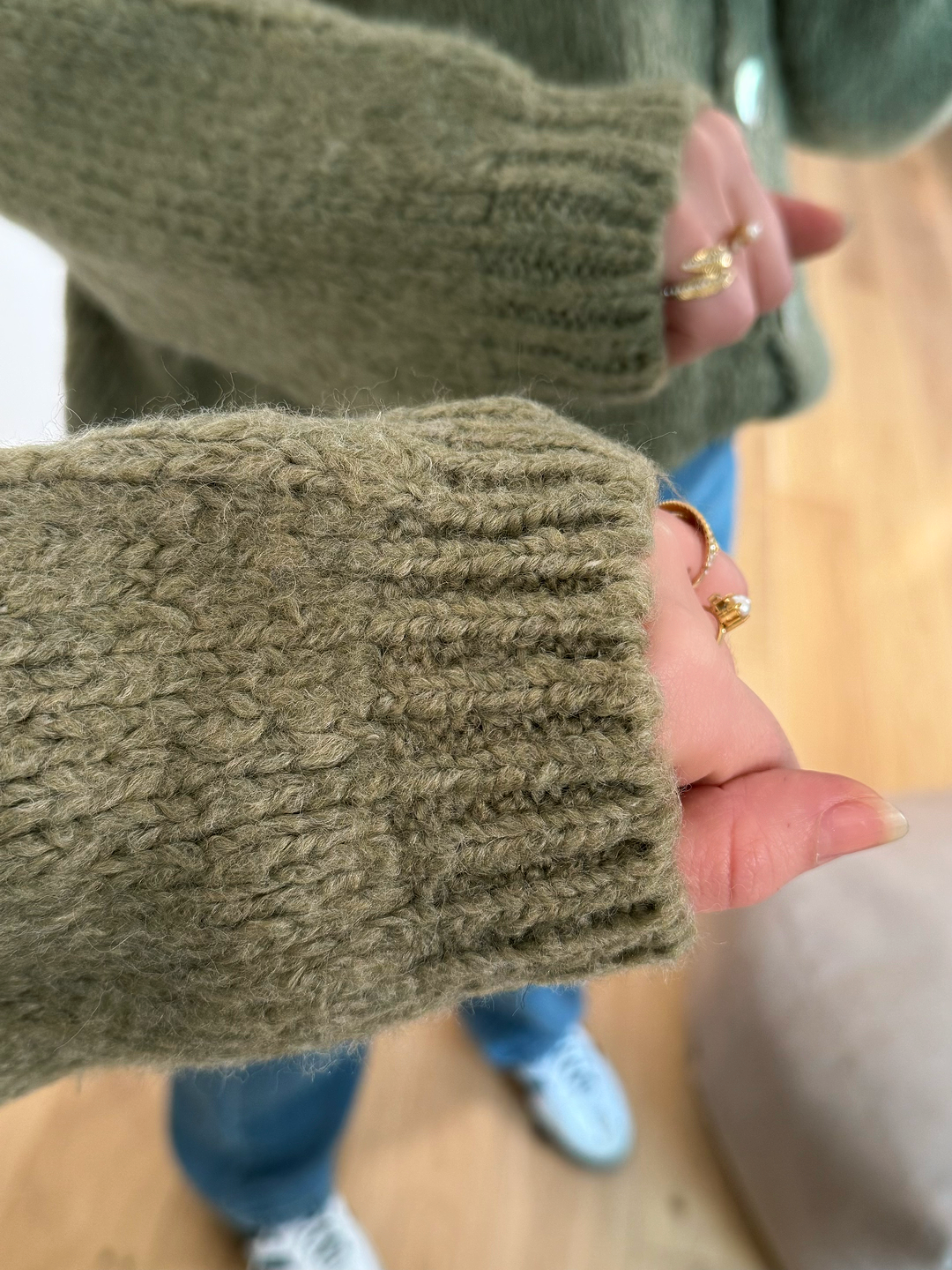 Gilet en maille épaisse au coloris vert kaki naturel, parfait pour un look à la fois tendance et intemporel. Sa texture douce et légèrement duveteuse apporte un véritable confort, tandis que sa coupe loose structure joliment la silhouette sans la marquer.