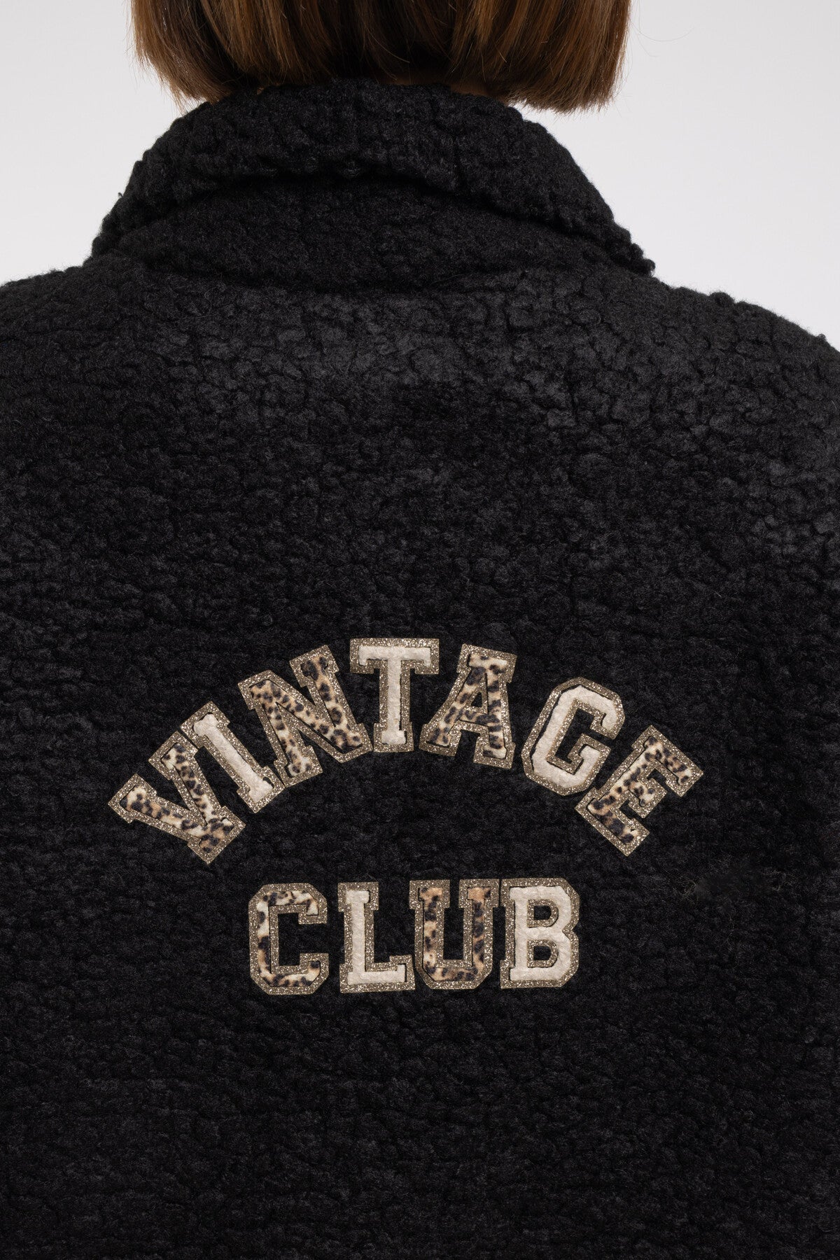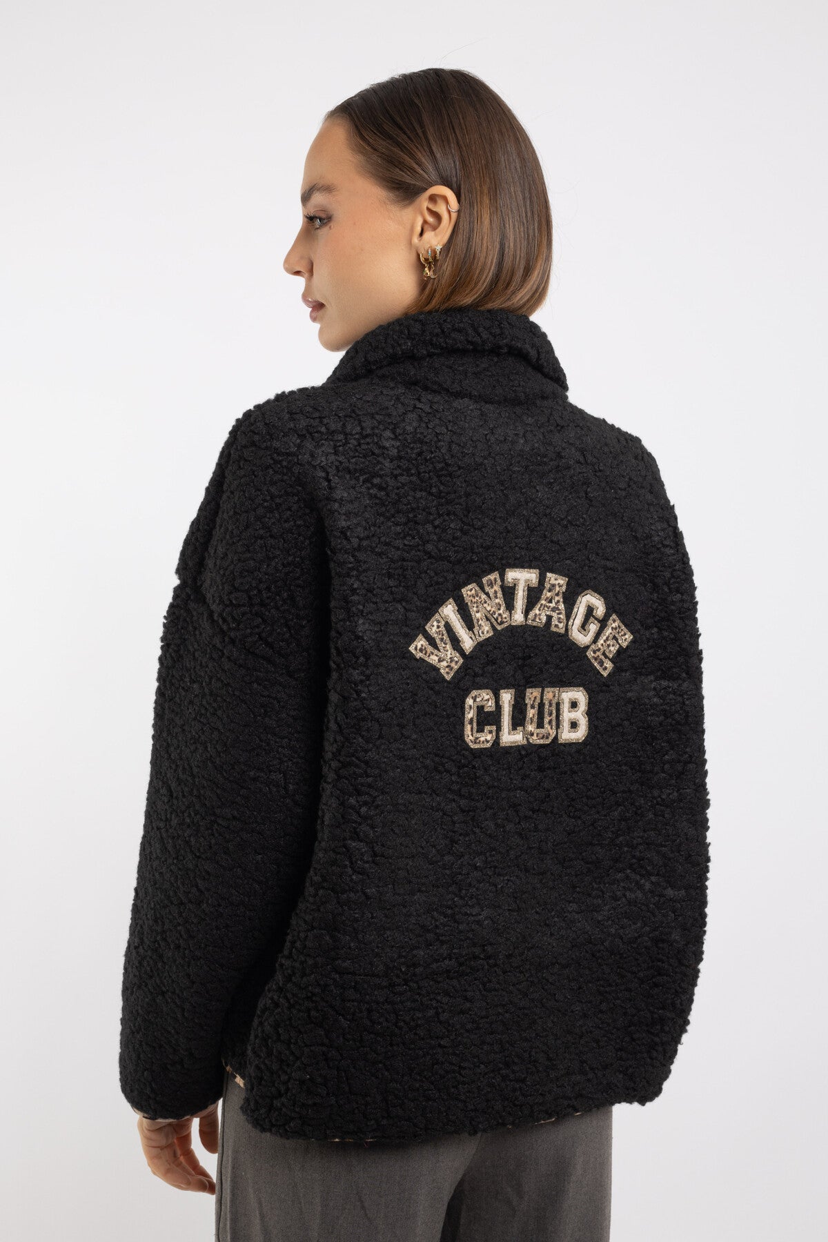 Sweat effet mouton noir au toucher doux et chaleureux, parfait pour un look cosy du quotidien. Son col montant zippé et sa coupe confortable en font une pièce facile à porter. Le message brodé “Vintage Club” au dos, associé à des détails léopard discrets, apporte une note tendance et originale.