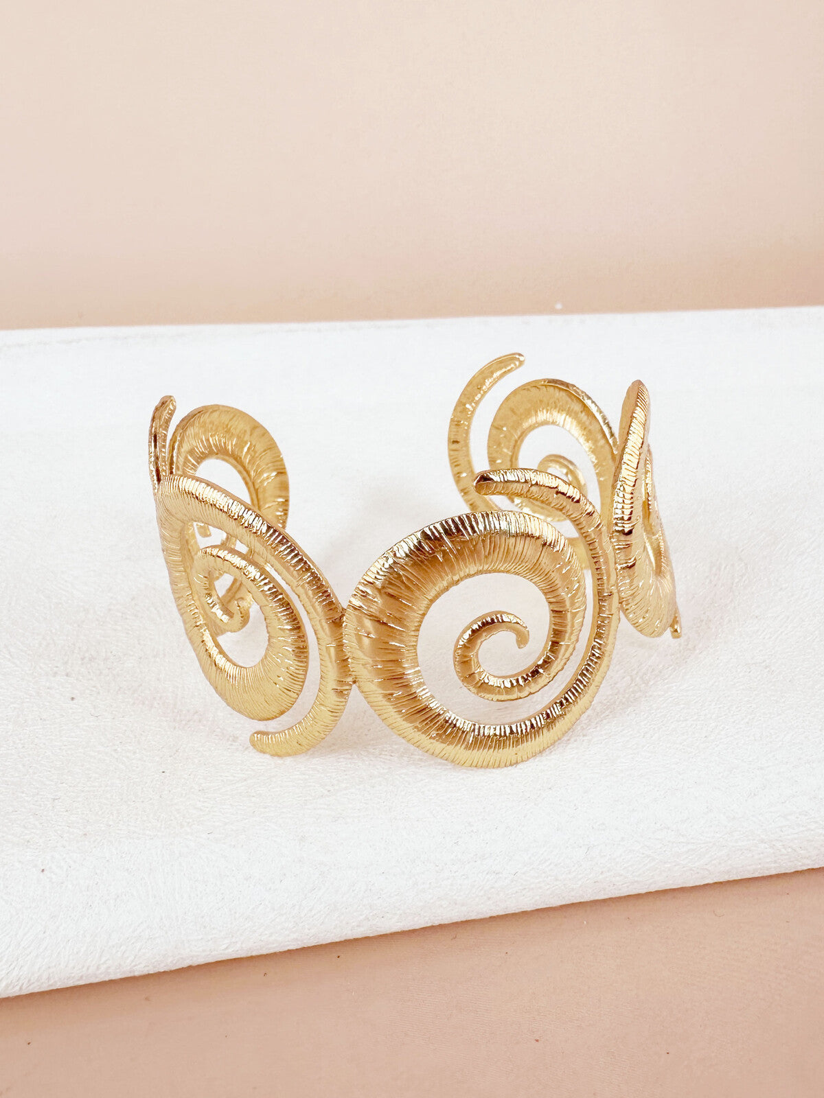 Une manchette au design spectaculaire, ornée de grandes spirales sculptées qui apportent mouvement et caractère à votre poignet. Son style artistique et élégant en fait une pièce forte, idéale pour sublimer une tenue simple ou compléter un look chic et affirmé.
