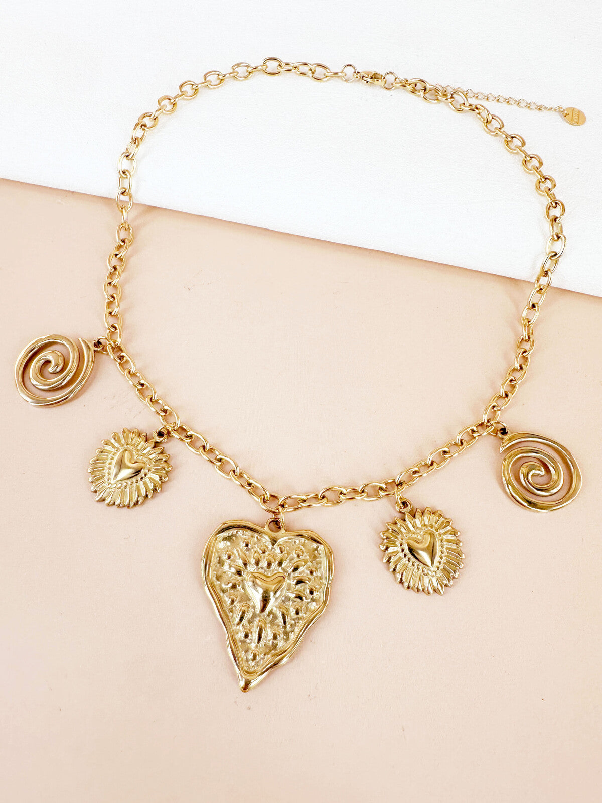 • Pendentifs : soleil sculpté, médailles gravées, cœurs brillants